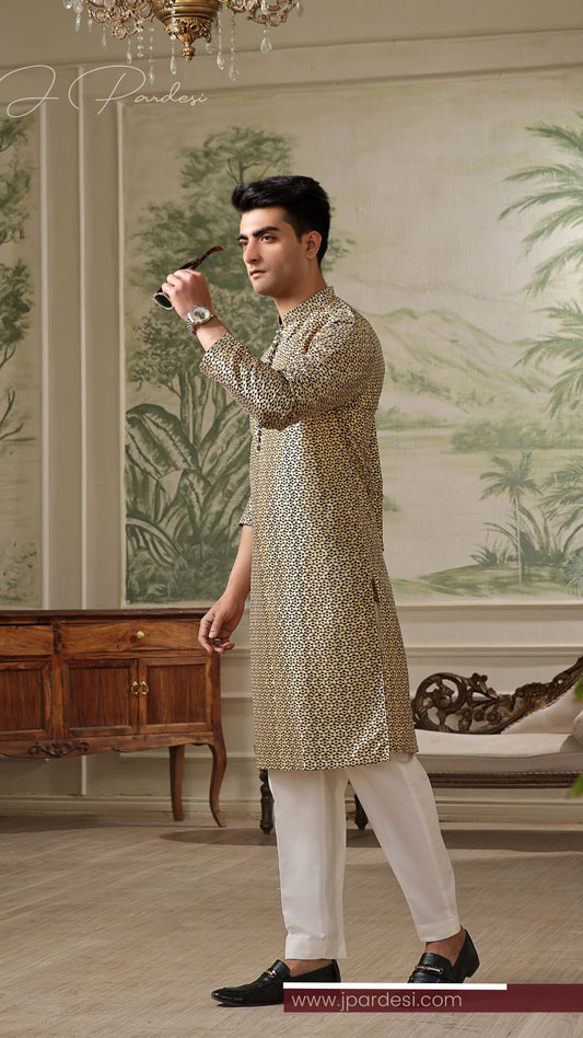Gold embroidered Kurta Banarsi fabric Festive Eid Collection