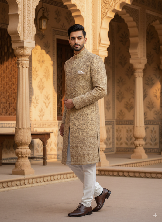 Desert Sands Hand-Embroidered Skin-Tone Kurta Pajama Festive Collection