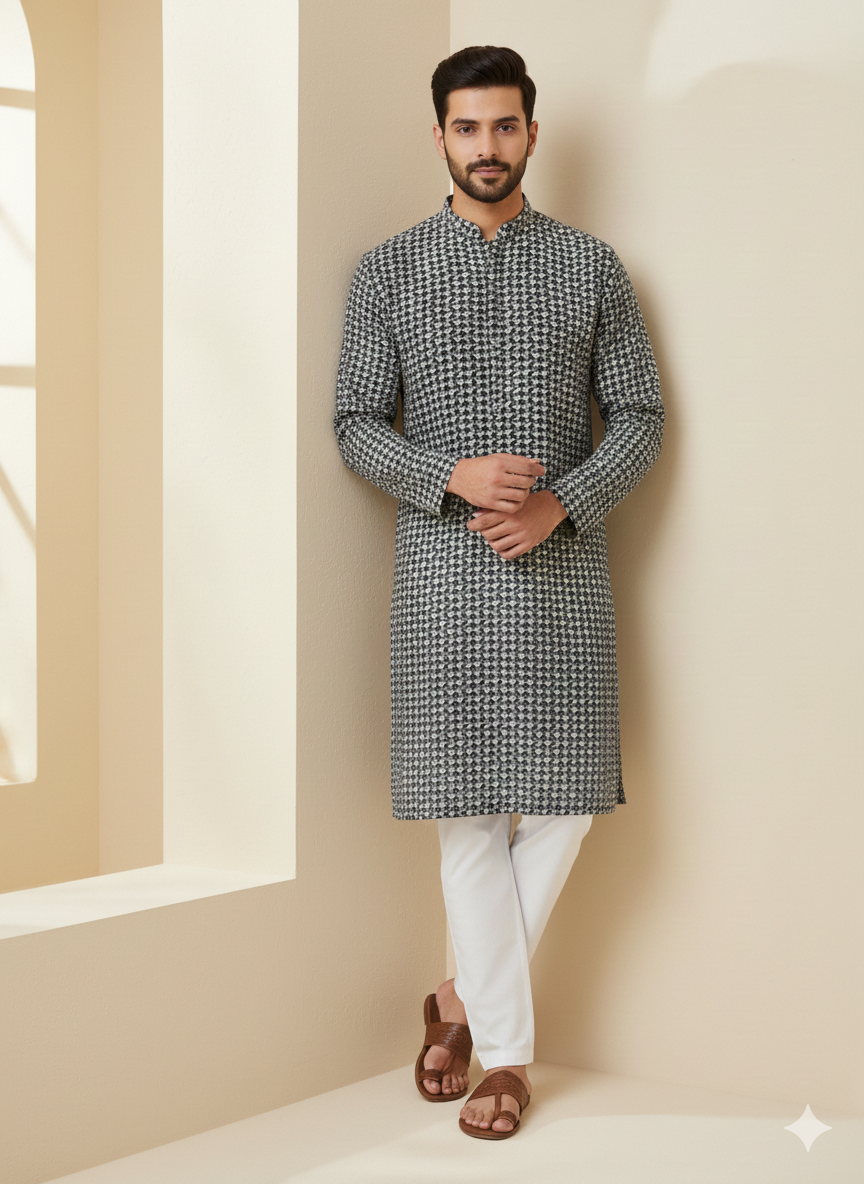The Aks black and white chicken kari kurta offers a classic design complemented by a white pajama. This combination provides a sophisticated yet comfortable option for formal occasions, showcasing traditional craftsmanship with attention to detail. The kurta's intricate pattern enhances its aesthetic appeal, making it a versatile addition to a man's wardrobe.