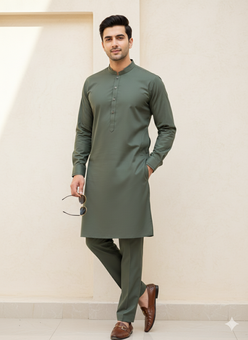The Deep Green Kurta Pajama, crafted from high-quality cotton fabric, offers breathability and comfort for all-day wear. This attire is ideal for traditional occasions, ensuring a sophisticated appearance while maintaining ease of movement. The rich green hue adds a touch of elegance, making it a versatile choice for various events.