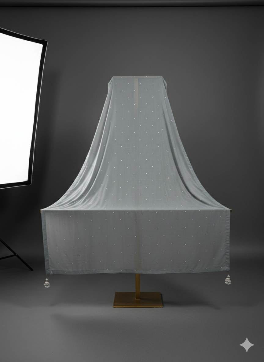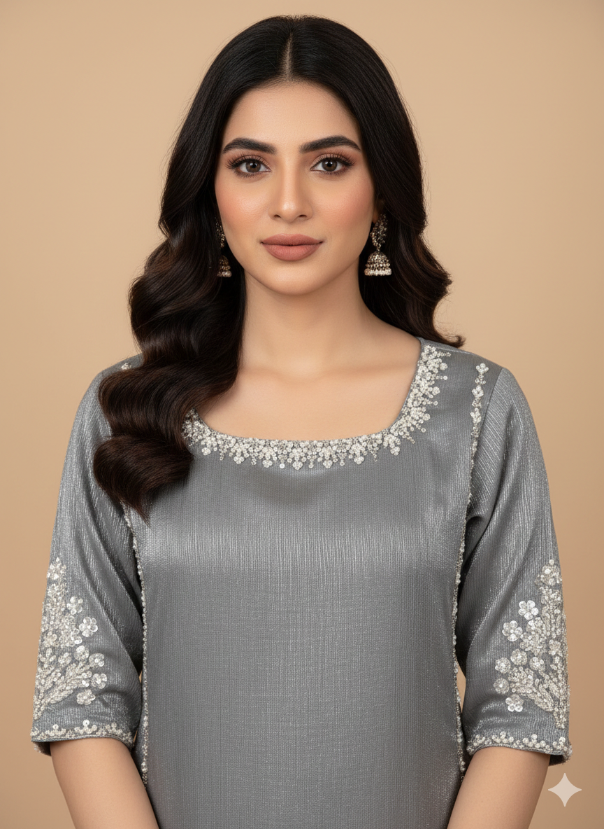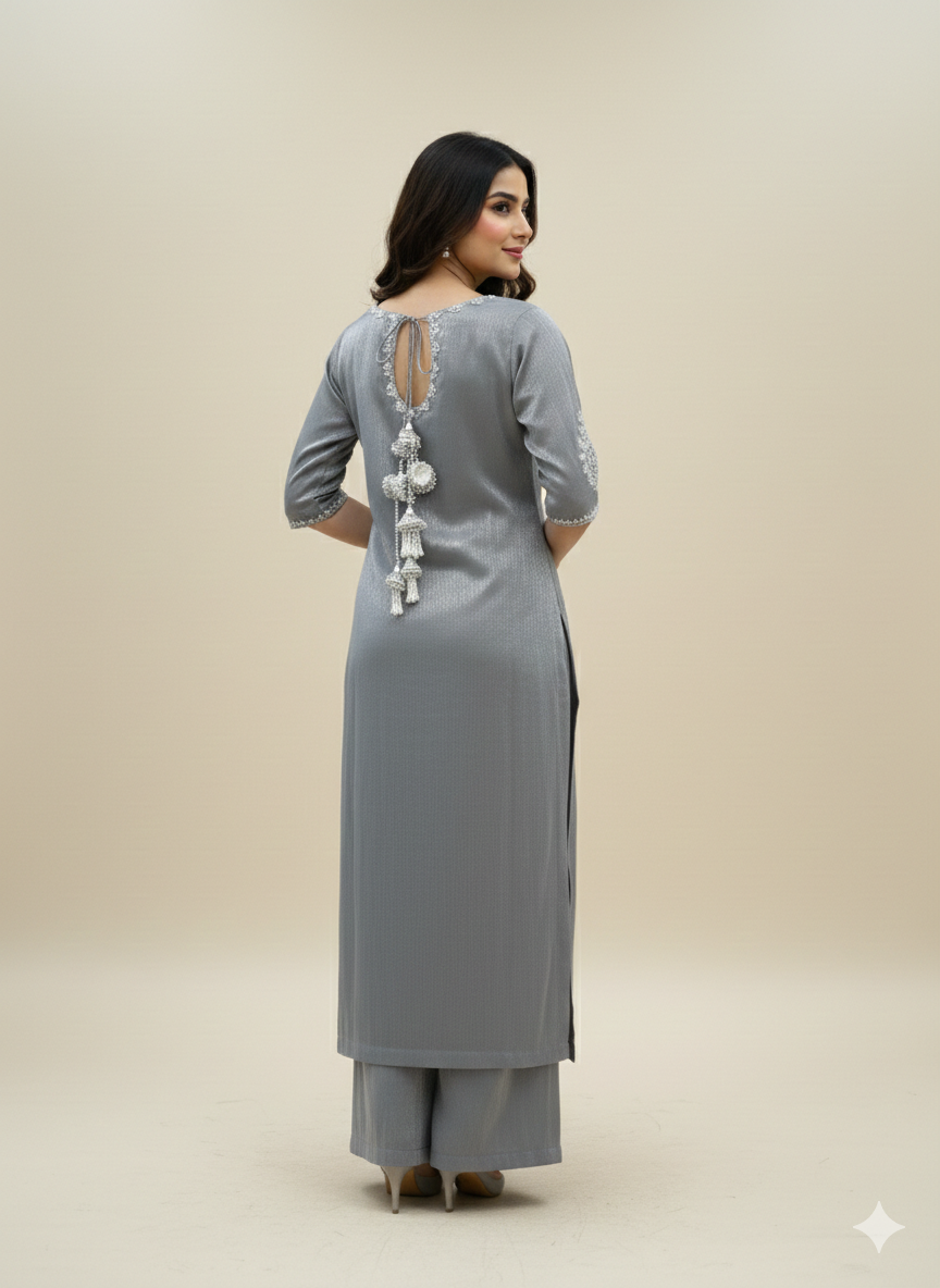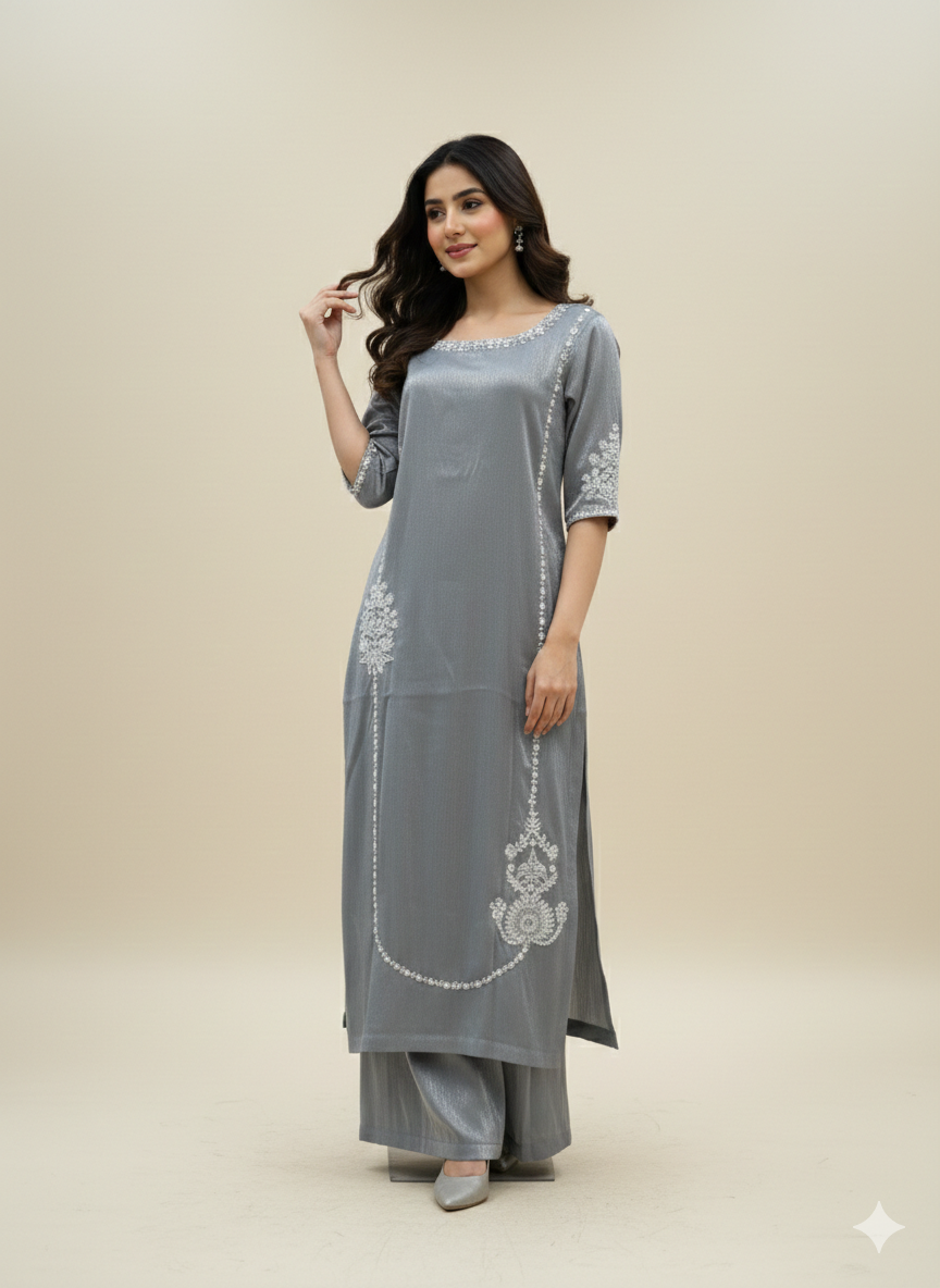 Silver crinkle lava silk ensemble featuring intricate hand embroidery on the gala and front. Paired with matching crinkle lava silk garara pants, complemented by a chiffon dupatta adorned with delicate chan detailing.