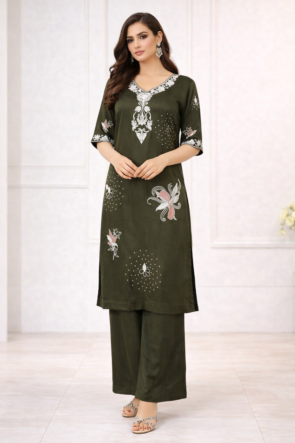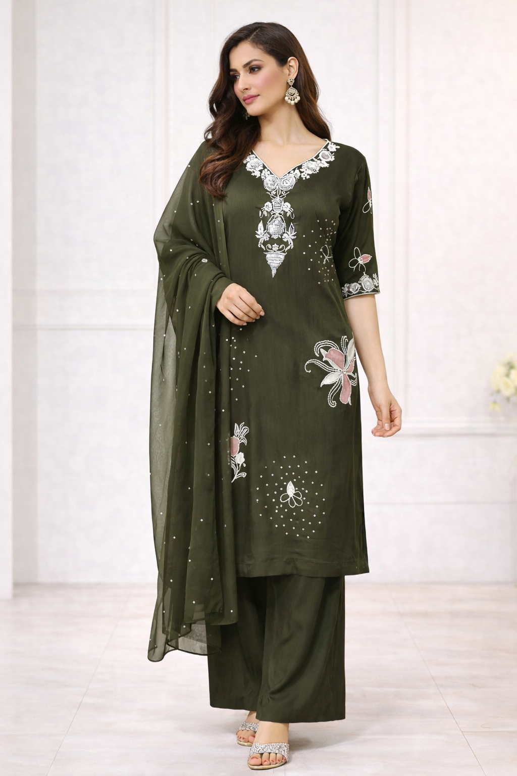 Olive Blossom is crafted from high-quality silk fabric, featuring intricate hand embroidery across the front and gala, ensuring a sophisticated appearance. The ensemble includes a matching dhaka pajama for a cohesive look and a chiffon dupatta adorned with delicate chan, adding elegance and versatility to the outfit.