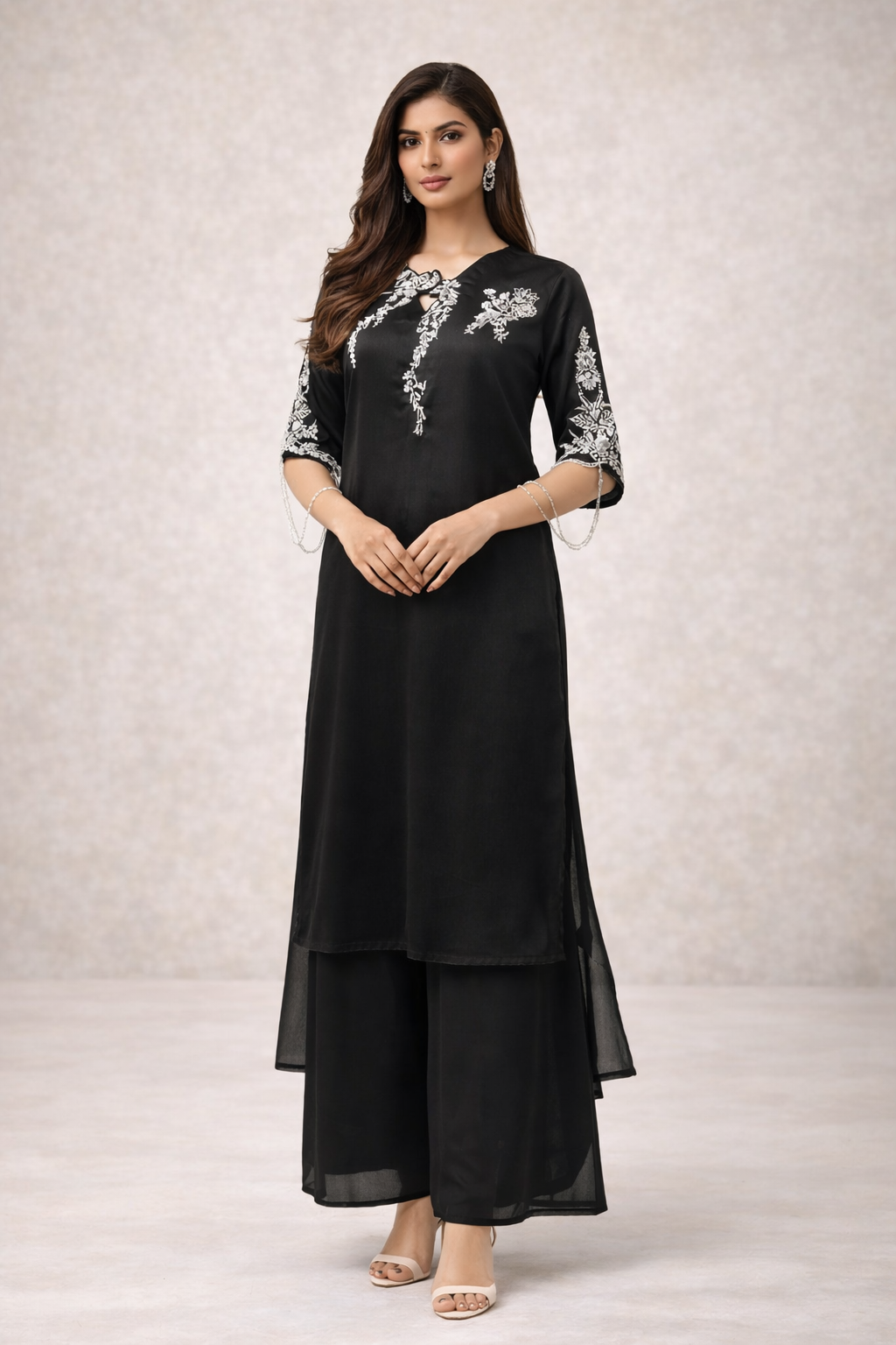 Olive Blossom is crafted from high-quality silk fabric, featuring intricate hand embroidery across the front and gala, ensuring a sophisticated appearance. The ensemble includes a matching dhaka pajama for a cohesive look and a chiffon dupatta adorned with delicate chan, adding elegance and versatility to the outfit.