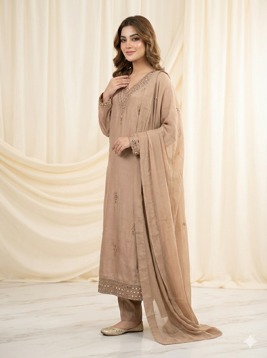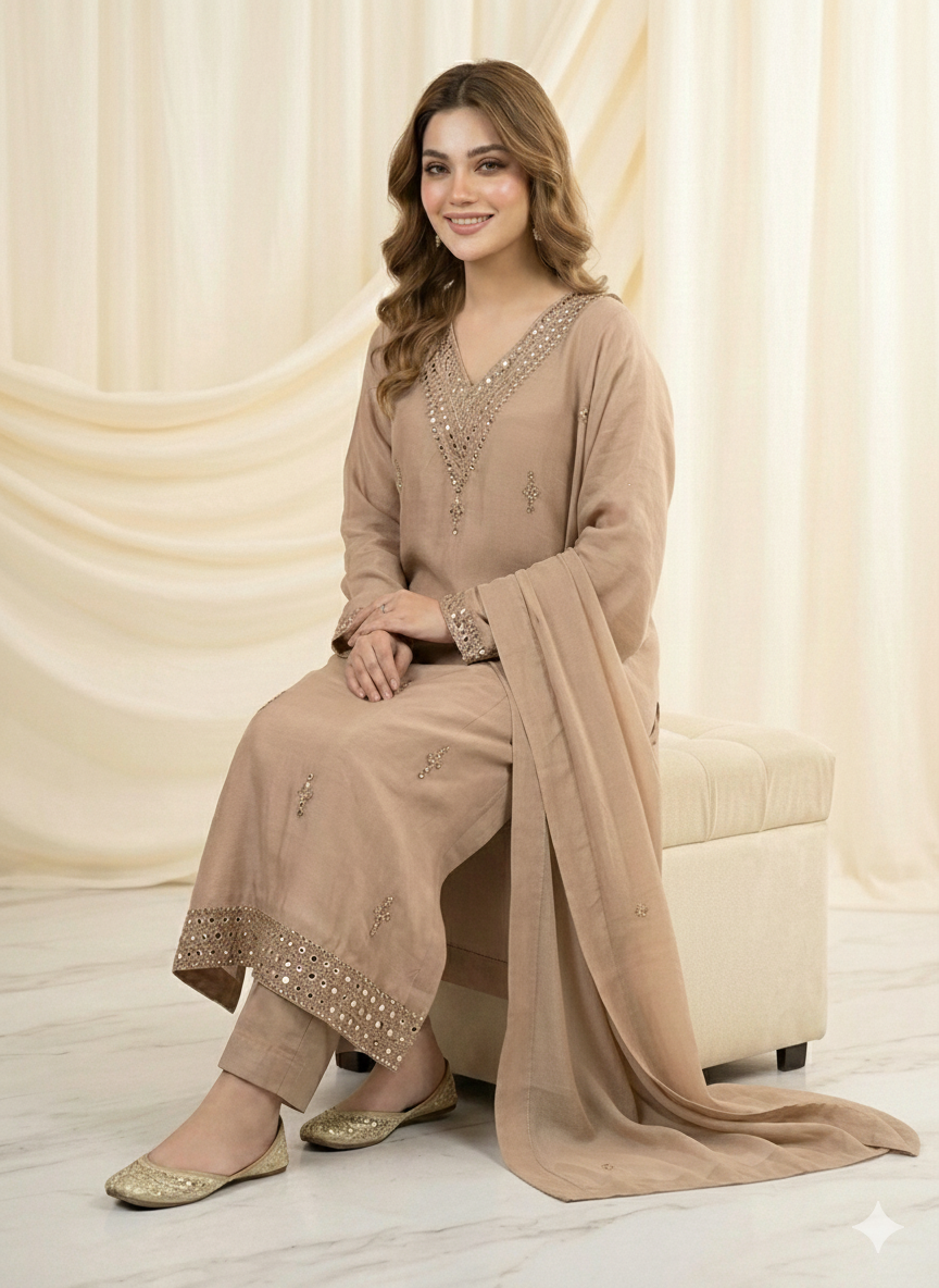 Completing the ensemble is a delicate chiffon dupatta, adorned with elegant mirror chan work that enhances the overall sophistication of the outfit. The lightweight chiffon drapes effortlessly, adding a soft and feminine touch.