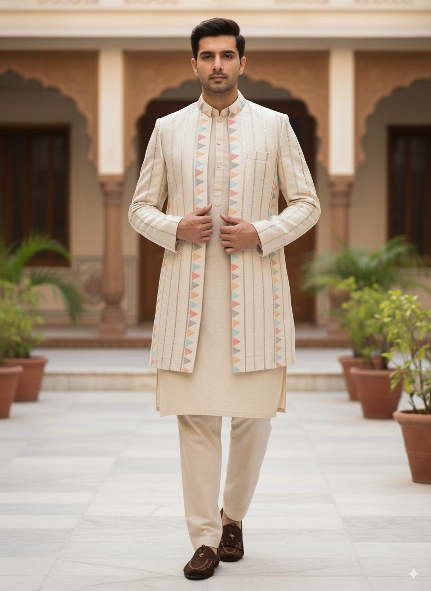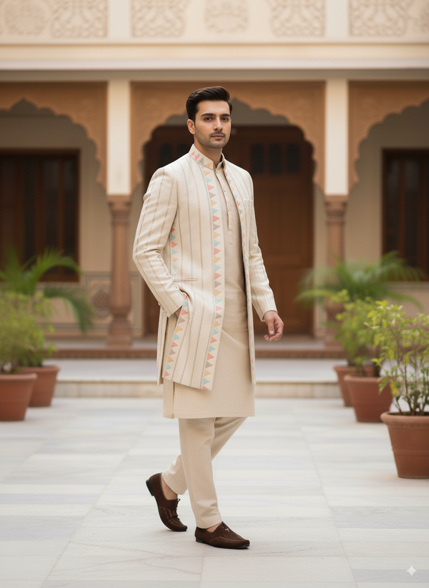 Dastaan e Safar is a sleek and stylish frontopen sherwani, perfect for special events. With its unique design, this sherwani presents a modern twist on a timeless classic, exuding confidence and sophistication. The perfect choice for those seeking a sophisticated and contemporary look.
